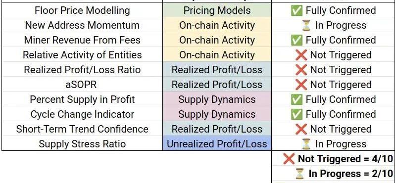 以2022-23年殘酷的熊市為背景,利用鏈上數據的透明度,并考慮市場投資者心理因素,我們開始模擬典型的投資者行為,以確定周期底部是否正在形成,這些行為標志著可持續的市場復蘇正要開啟。識別周期變化不是一件容易的事情,目前并沒有“唯一標準”。為識別比特幣熊市的后期市場走向,本文我們將探討追蹤熊市復蘇的十大指標。該指標是使用各種技術和鏈上信息,發現了四類基本市場屬性和投資者行為模式基本一致:技術性:相對于熱門技術分析工具的均值回歸。鏈上活動:鏈上活動和網絡利用率積極上升。供應動態:長期持有者持有的貨幣供應飽和。利潤/虧損:鏈上的盈利支出和賣家的“子彈耗盡”。根據每個指標的定義,將使用以下術語對截至撰寫本文時的當前市場狀況進行總結:?未觸發?正在進行中?完全確認指標1:尋找底部價