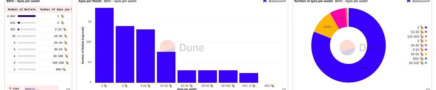 今天上午,“無聊猿”BAYC關閉了SewerPass,宣告DookeyDash游戲暫告一段落。根據NFT研究機構Sealaunch發布的「BAYC持有者分析」報告,在過去的7天里,BAYC持有者買賣最多的NFT便是SewerPass,交易量超過2400個ETH。該報告中還有一些有意思的BAYC持有者鏈上情況分析。例如,誰是BAYC的最大持有者,他們擁有多少MAYC和BAKC?哪個BAYC交易次數最多?哪些NFT市場是BAYC主要交易市場?BAYC持有者還持有哪些其他NFT藏品?一、每個錢包持有多少個BAYC?