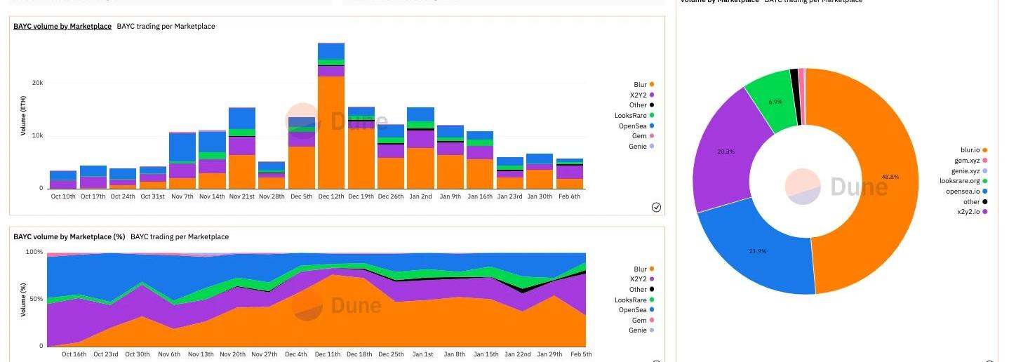 過去,BAYC基本都是在OpenSea上交易的。但隨著新興NFT市場的推出,OpenSea的份額開始讓渡給LooksRare、X2Y2以及最近大火的Blur。數據顯示,在過去的120天里,約50%的BAYC交易量發生在Blur上,而OpenSea上BAYC交易量占比只有22%,X2Y2約占20%。這也從側面得出結論,OpenSea對藍籌NFT交易的依賴性降低,如BAYC和其他Yuga的NFT,而Blur則依賴性較高——撰寫本文時,Blur約43%交易量由藍籌貢獻。六、BAYC持有者還持有哪些其他藏品?