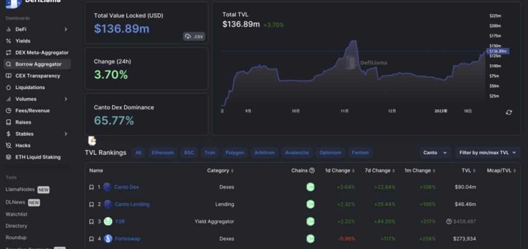 根據DeFiLlama數據顯示,自新年以來,Canto鏈總TVL一直呈現快速增長趨勢,近7日增長20.36%,近一月增長93.53%。其TVL已從年初的6600萬美元增長至目前的1.36億美元。若去除Polygon、Arbitrum、Optimism三個Layer2項目,目前是24h交易量第七大Layer1。