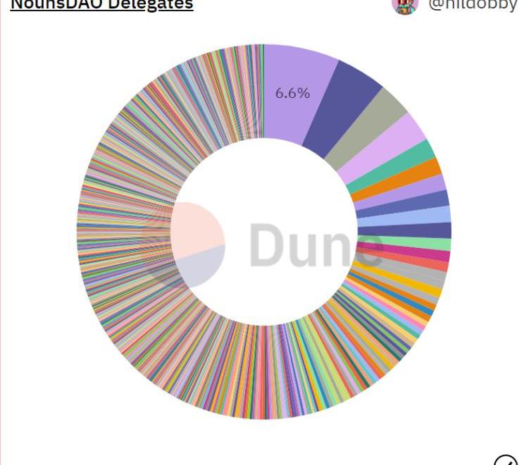 如圖,創始團隊通過智能合約發布$cult代幣,用戶自由選擇是否質押。質押將會得到$dcult代幣,持有量前50名將動態自動成為守護者,守護者有權發起提案,但無法參與治理投票。其他dCult持有者擁有CultDAO的治理投票權力。選民也可以自發將其選票委托給公開選出來的代理選民。個人資產是衡量守護者資格的唯一標準,所以代理選民不會因此成為守護者。用戶交易$cult時需繳納0.4%的稅款。這些稅款自動進入國庫。每當國庫積攢到價值為15.5ETH的$cult時,就會將其中價值13E的$cult用于投資提案,余下價值2.5E的$cult則被自動銷毀,從而實現通縮。DAO投資其他提案時,所投資的提案需在一定時期內將一定比例的所發代幣兌換成$cult,兌換的$cult中有一半獎勵給$dcult持有者,另一半將被銷毀。新提案獲得投資的前提是國庫擁有至少價值15.5ETH的$cult。據官網顯示,目前$cult價格為0.00000910美元,總市值為41,178,371美元,已發送1,391個ETH,說明已經有107個提案被投資。NounsDAO——投票表率