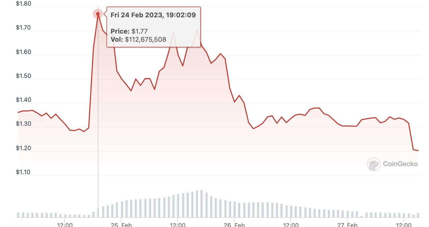 2月9日,BinaryX社區就已通過BNX代幣拆分提案,BNX將以1:100的比例拆分舊代幣、發行新代幣。2月24日晚,BinaryX又正式發布了游戲更新。Coingecko數據顯示BNX一度達到1.77美元的高點,較前一日漲幅約33%。項目方新動作不斷,點燃起玩家的情緒,大量的資金變為BNX涌入BinaryX之中。玩家從幣安提幣的數量之多,一度讓幣安熱錢包的BNX幾近枯竭,短暫關閉了BNX提幣。而在新版本上線之后,玩家卻發現事情并不像自己想象的順利。CoinGecko數據顯示,在新版本上線一小時前BNX價格達到近日以來最高點,此后BNX即一路走低。玩家投入的BNX本金已出現USDT本位虧損。