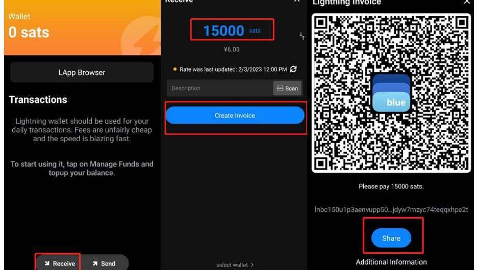 隨后我們進入錢包,點擊左下角的「Receive」,然后進入創建Invoice的頁面,我們在上方藍字處輸入我們想要收到的Sats金額。化名。一個satoshi等于0.00000001BTC)這里我們試試15000Sats,點擊「reateInvoice」。稍作等待后就會出現一個新的二維碼和以Inbc開頭的地址。