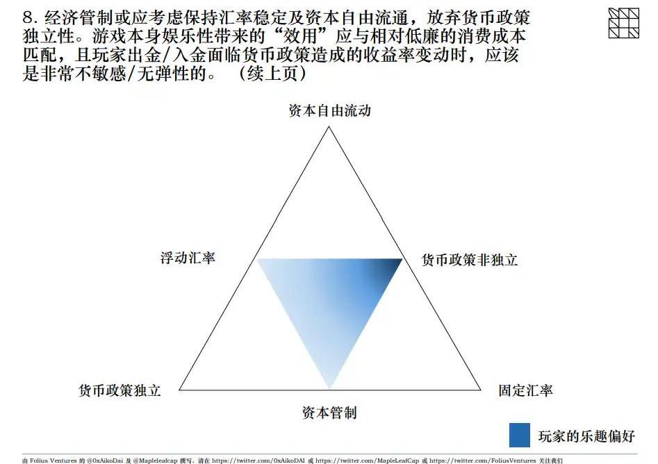 對于游戲中的耐用品,我們傾向于將其巧妙地轉化為消耗品,或在老化后讓其手感和體驗差異化,并利用分層機制長期維持廣泛的市場需求,讓耐用品價值最終沉淀而非冗余。傳統游戲封閉式經濟中,游戲二級市場被官方限制或僅有拍賣行,市場設計較為簡單直接。但我們傾向于將上下鏈過程游戲化,例如資產在鏈上市場交易時會隨機發生變異,回到游戲后通過「清洗」服務費代替版稅,玩家也可參與到相關道具和服務的提供環節。經濟管制應考慮保持匯率穩定及資本自由流通,放棄貨幣政策獨立性。因為游戲作為娛樂其成本應相對低廉,且寬松的資本管制和穩定的貨幣匯率更符合玩家的興趣偏好。