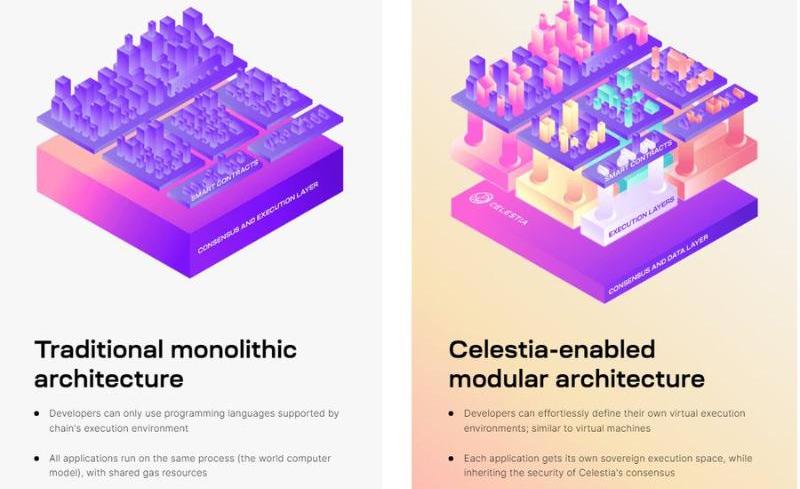 因為執行層、共識層、結算層和數據層都結合在一個單一的第1層中,所以整體的帶寬量是有限的。模塊化區塊鏈由模塊化執行層構成,能夠更好地利用共享數據的可用性。