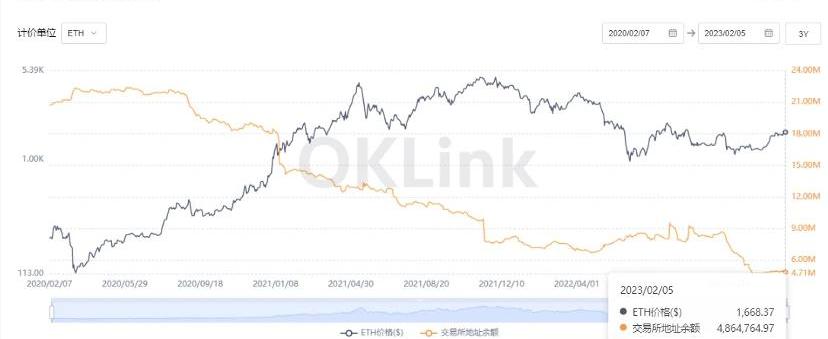 近幾年來,ETH交易所余額呈持續減少的趨勢,已經降至500萬枚以下。