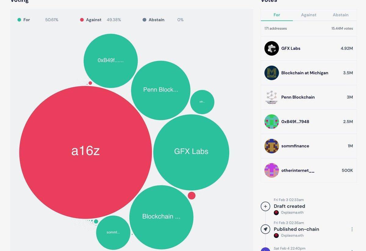 但這當然不是最終結果,因為a16z并未投票。要知道,A16z擁有1500萬個UNI代幣,他們為何不投票?難道不支持LayerZero嗎?當然得支持,只是此次沒法投。因為他們讓Fireblocks托管了UNI代幣,無法對鏈下提案進行投票。但,他們依然可以對鏈上提案投票。于是在鏈上投票階段,A16z果斷拒絕了Uni到BNBChain部署提案。原因很簡單,此次社區并未選擇a16z所支持的LayerZero。對此,TheBlock研究員@Dogetoshi表示,這是a16z歷史上首次投票反對一項Uniswap提案。這可能會產生更廣泛的影響,因為Uniswap可能無法在許可證到期之前部署在BNBChain。換句話說,因此這場內耗,Uniswap有可能無法獲得在BNBChain上的先發優勢。所幸,投票并未結束,事情仍有轉圜余地。目前戰況非常膠著,大家可以通過這個鏈接持續追蹤后續進展:https://www.tally.xyz/gov/uniswap/proposal/31