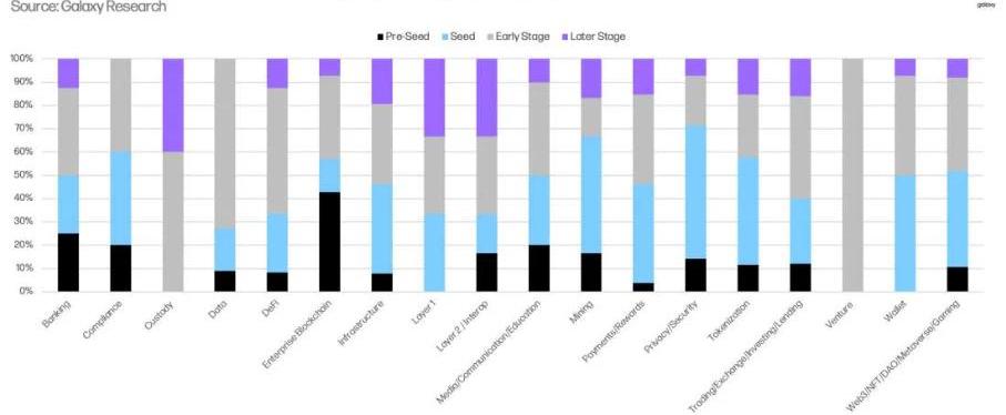 當我們按照行業類別和發展階段來劃分投資交易時可以發現,投資大多投向了處于早期發展階段的Web3公司。在Web3、錢包、隱私/安全、合規和挖礦類別的投資中,有超過50%的交易都是發生在處于種子輪和種子前,在交易和數據類別的投資,有60%都發生在A輪及之后。
