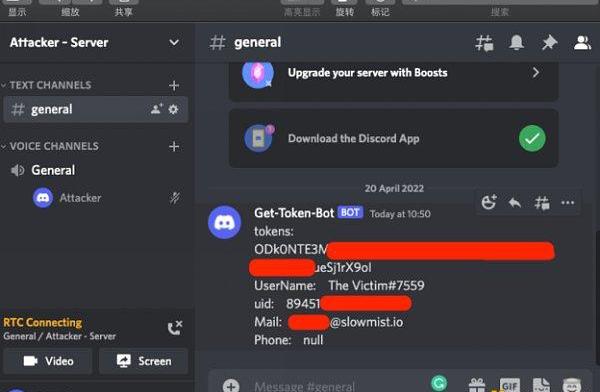 下面是演示攻擊者編寫的JavaScript代碼獲取Token等個人信息后,通過DiscordServer的webhook接收到。