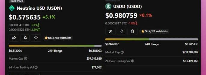 Tron的USDD和Wave的USDN是僅有的兩個以其原生代幣為抵押品的UST穩定幣。盡管兩者都低于掛鉤交易,且不是純粹的算穩。