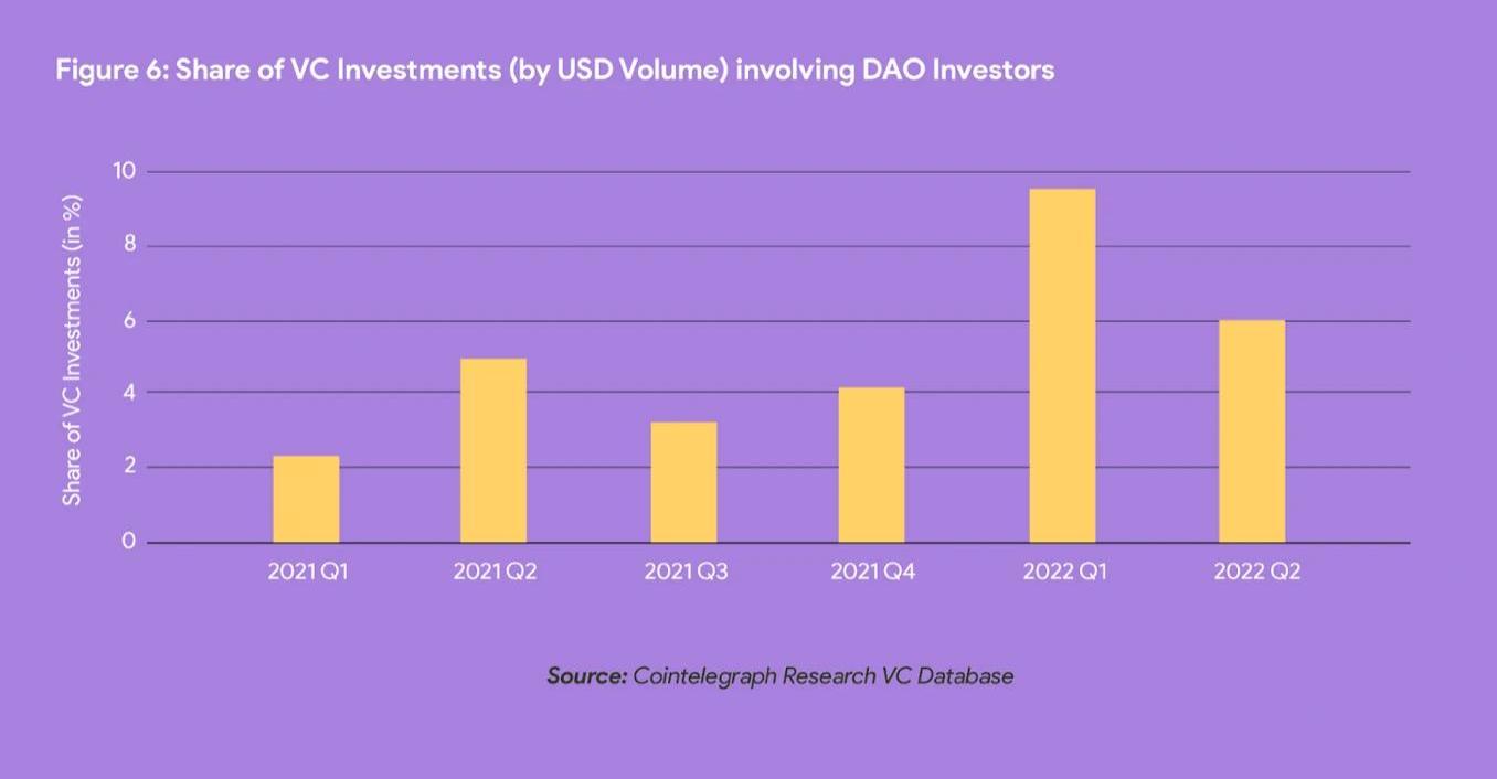 DAO中的VC投資VC參與DAO可以歸因于DAO的可塑性以及它們如何輕松形成并專注于不同的目標。風險投資家將它們視為獲得投資回報的潛在良好工具,即使它們比其他加密投資工具承擔更高的風險。DAO是VC對另一個項目的投資,在2022年第一季度約占所有VC投資的9%,并在第二季度下降到不到6%。這與傳統金融機構和風險投資公司的當前趨勢一致。