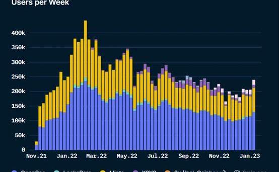本周Gas基本與上周持平,當前鏈上轉賬平均費用約為$1.41,Uniswap交易平均費用約為$4.62,Opensea的平均交易費用約為$1.76,從Gas消耗來看Opensea的seaport協議占據第一,Blur消耗也占據前5名,短期內NFT交易活躍度出現較大提升,另外近期Optimism鏈出現消耗增加現象。5.NFT市場數據變化