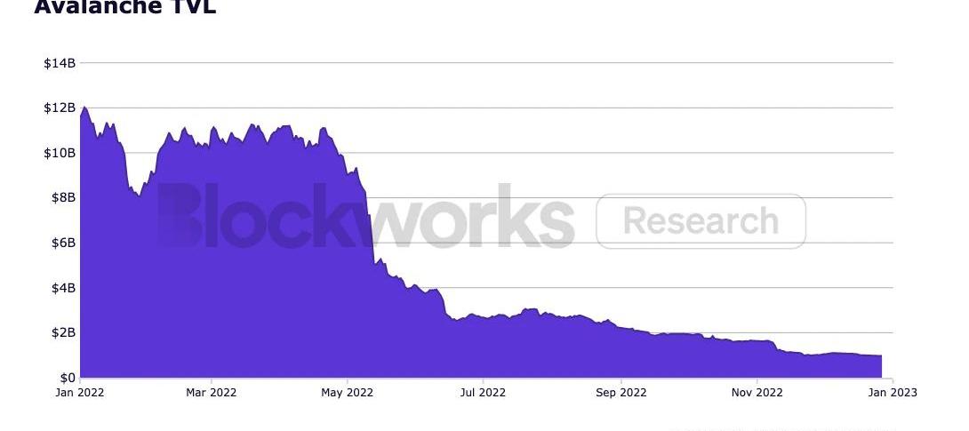 2022年下半年,Avalanche生態系統經歷了一段相對停滯的時期。今年6月,作為該網絡上構建項目的主要支持者的3AC的倒閉,導致Avalanche生態系統在風險規避環境下的投資減少。鎖定的總價值從120億美元下降到10億美元。Avalanche的TVL下跌92%,與其同期AVAX價格下跌89%保持一致。