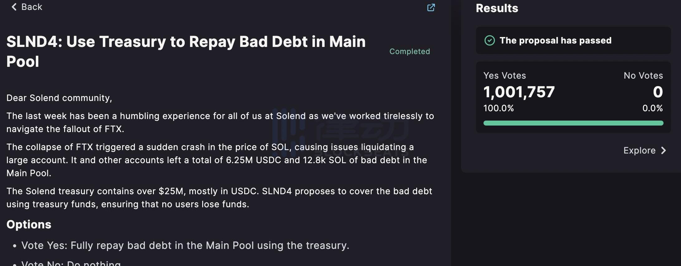 Solend發起投票,用國庫賠償壞賬不過最終Solend發起DAO提案投票,希望這筆壞賬由國庫賠償,最終投票通過。由于鯨魚的一部分債務因此被轉移,也避免了清算進一步拋售SOL造成價格下跌,進而造成更大的崩盤。FTX/Alameda發行的soBTC/soETH不可贖回