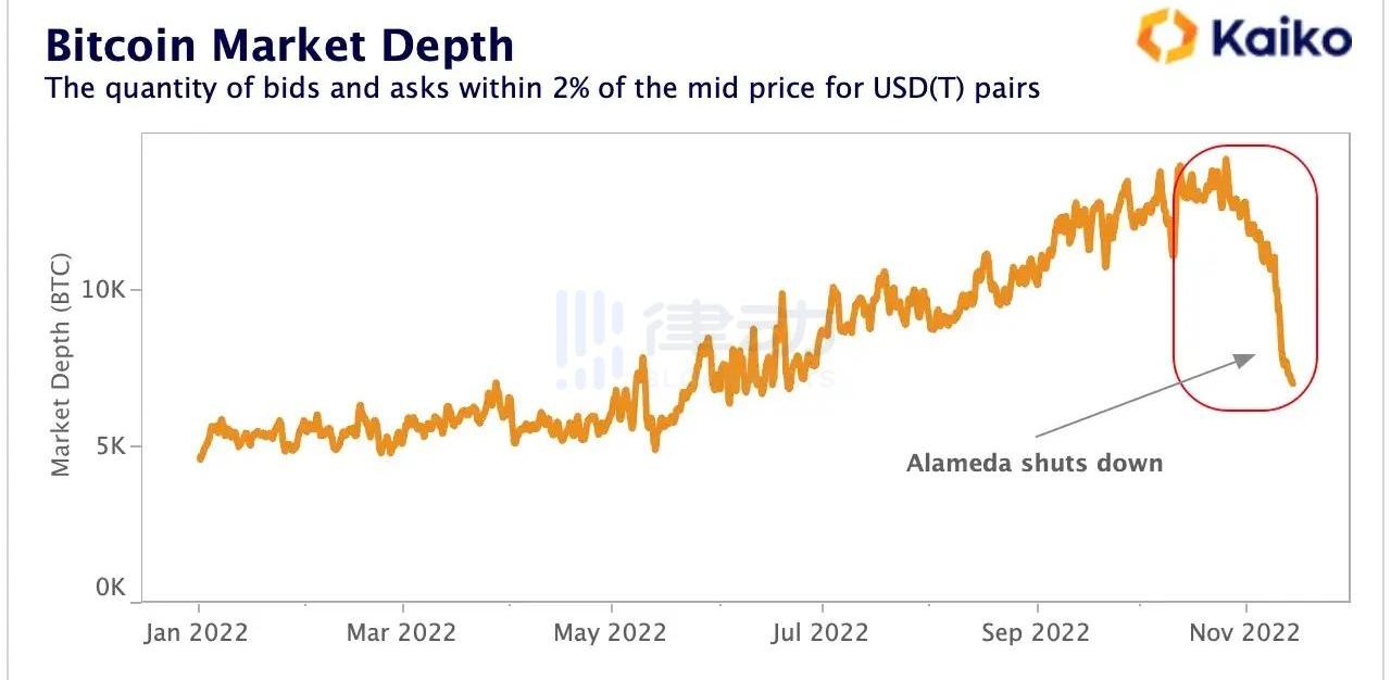 由于加密市場的大部分流動性都是由Alameda、Wintermute、AmberGroup、Genesis等幾家大型做市商主導的,隨著作為最大的做市商之一的Alameda宣布停止交易,市場流動性驟降。更嚴重的是,跟隨FTX暴雷事件的推進,AmberGroup、Wintermute和Genesis也均已宣布他們的資金被困在FTX上。大廈將傾,散戶們也為了規避風險恐慌出逃,這多方面原因的疊加更進一步地加劇了市場流動性緊縮危機,