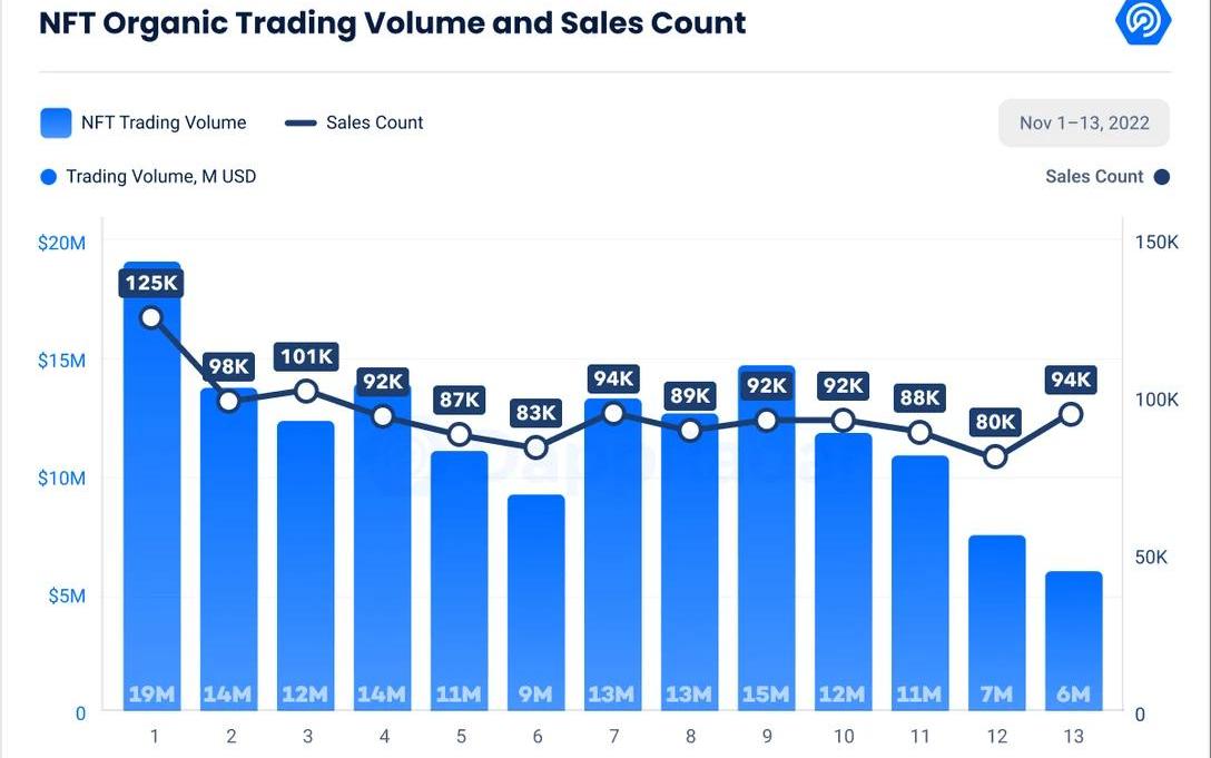 NFT市場遠未消亡,其當前交易量的下降是由于社會經濟因素,而不是用戶興趣的下降,因為這兩周的銷售量僅下降了24.50%。