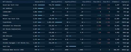 當前鏈上轉賬費用約為$1.95,Uniswap交易費用約為$6.64,Opensea的交易費用約為$2.58,本周受行情暴跌影響,連續幾日出現Gas激增現象,UniswapV3交易活躍,另外近期頂級量化交易機構Jumptrading2的賬戶24小時內Gas消耗達到343個ETH,排名前五。4.NFT市場數據變化
