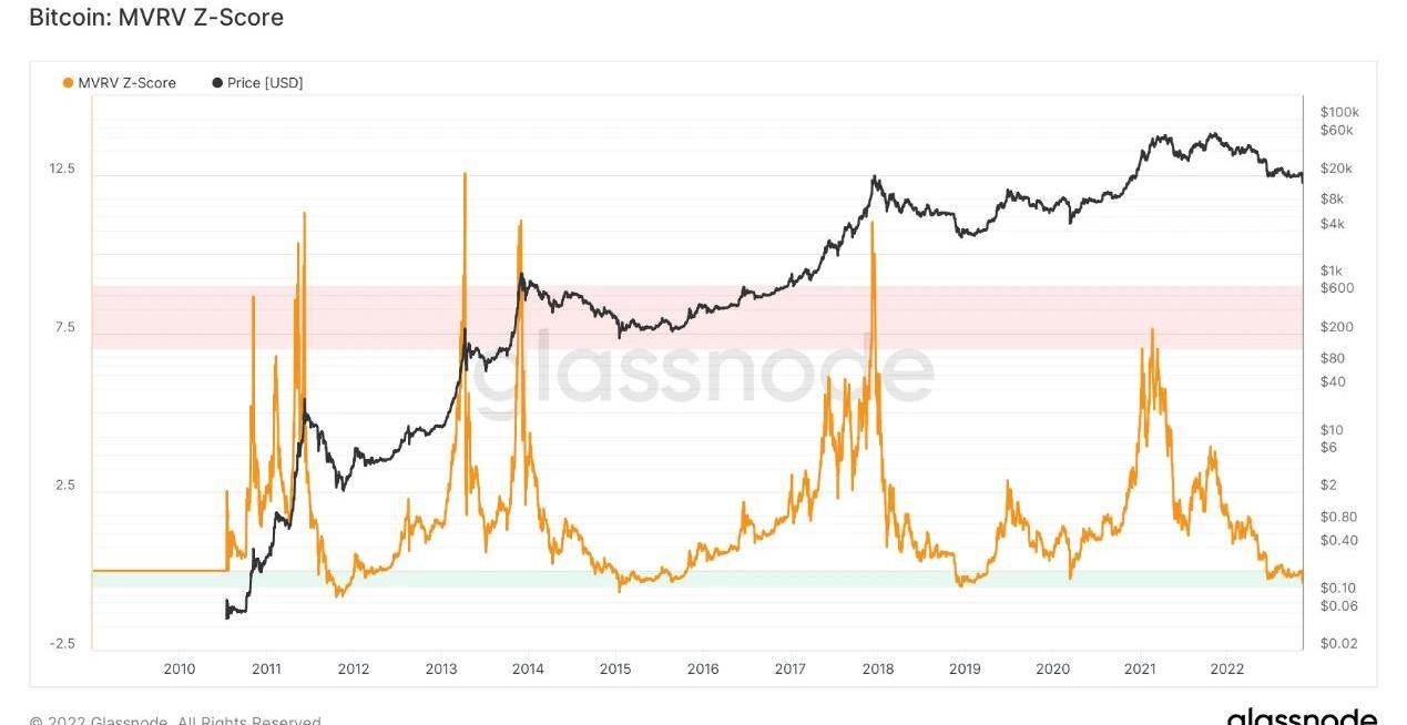 長期趨勢指標MVRV-ZScore以市場總成本作為依據,反映市場總體盈利狀態。當指標大于6時,是頂部區間;當指標小于2時,是底部區間。MVRV跌破關鍵水平1,持有者總體上處于虧損狀態。當前指標為-0.37,處于綠色抄底區間。