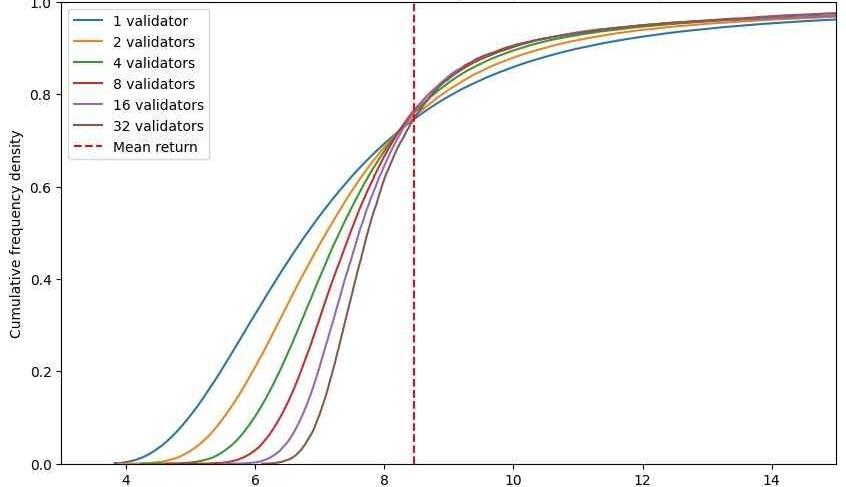 我們要考慮的最后一個問題是,運行多個驗證者的質押者有著怎樣的收益分布情況。在下面的圖表中,我們模擬集中的驗證者被分為2、4、8、16和32個驗證者的組別,用于比較不同組別大小的ECDF年回報率。圖中的紅色虛線表示的是整個驗證者集的平均回報率。我們預計,平均回報率是大規模驗證者組別在扣除任何費用之前的收入。#calculateECDFsfor1,2,4,8,16,32validators