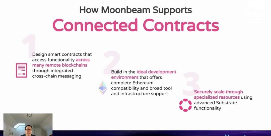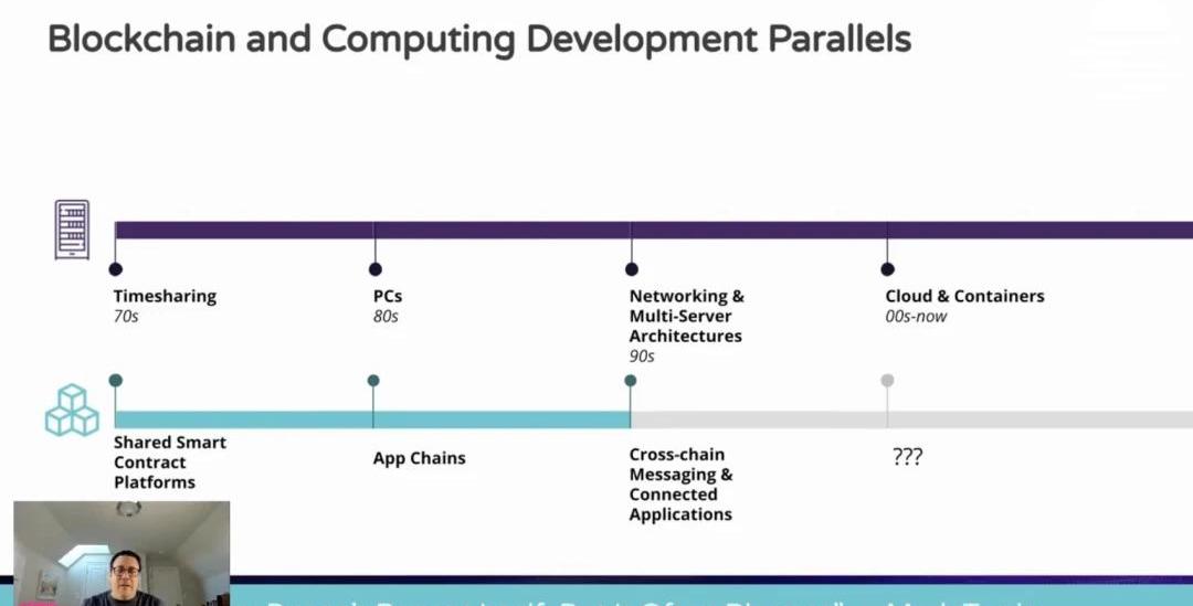 我的分享將包括:Moonbeam專注跨鏈的背景我們是如何構建跨鏈解決方案為何堅信多鏈未來的原因歷史總能給予我啟發,回顧技術變遷,讓我受益匪淺。正如馬克·吐溫曾說的,歷史不會重演,但總會有驚人的相似。我們能從歷史中感知到一套發展的規律。對我來說,通用計算的發展史是一次值得學習的前車之鑒,它的變遷演進和區塊鏈隨時間巨輪前行的道路類似,在時間的推移中持續發展。在這里,我展示了兩條時間軸。相信你還記得計算機在誕生初期是昂貴而又稀少的,計算機資源是稀缺的,但后期得益于完善的功能體系,更多的用戶共享獲得了計算機的功能。對比現在,這種規律依然存在,甚至在某些方面是正確的,當我們推及到區塊鏈,以太坊主網,甚至是Moonbeam。我們都很清楚,區塊鏈上的資源仍舊稀缺,很多使用者仍像使用計算機一樣共享區塊鏈的資源。如此說來,區塊鏈亦可簡單地視為社區化的計算機。到現在,我們的區塊鏈又有了新的演變,應用鏈映入眼簾。這就和電腦普及的歷史道路有些相像了,我們不用共享一臺電腦的資源,而是直接擁有自己的電腦。以此類推,應用鏈也正在區塊鏈世界中表達這一概念:即在Web3中,您的應用將匹配其專屬于它的區塊鏈,而不是在一個共享資源的區塊鏈平臺。我認為我們正處于一個萬鏈共生的環境,不管是應用鏈、共享資源的智能合約平臺都是首次出現在一起。他們相互之間能傳遞信息。要知道,“多鏈”是今年進入公眾視野的事。可能很多人沒有意識到,跨鏈互操作是今年興起,但卻在發展的初期成功引起了行業的關注,并且有可能成為去中心化應用的底層基礎設施。我認為,區塊鏈會向著云服務的方向發展。作為開發者,你能獲取用于發展應用的資源或服務,甚至更多。這是我作為開發者在行業內看到的趨勢,也是我們可預見的行業未來。ConnectedContracts是實現互操作的有效方案