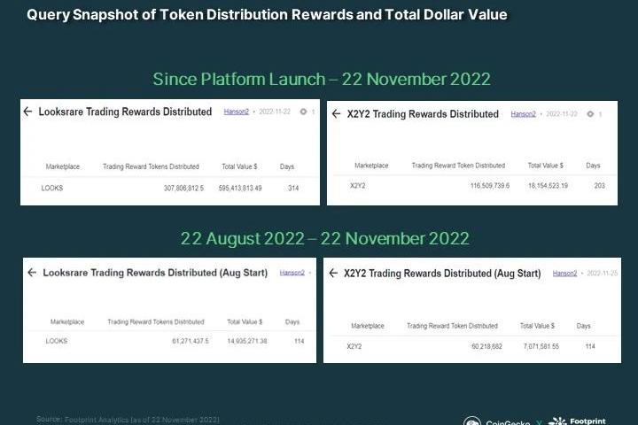 來源:FootprintAnalytics從以上圖中可以看到,LooksRare的洗盤交易量更高。我們認為是因為它的交易回報更加豐厚。我們根據每個代幣自推出以來的每日收盤價計算了交易獎勵的總價值。以下是截至2022年11月22日的結果。