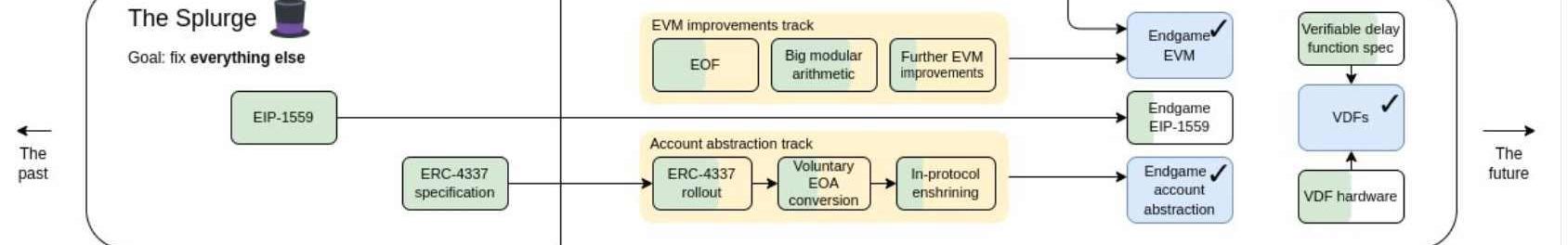 26/30最后的第六階段,Splurge,目標特別意思:修復一切。比如說EVM,很多東西要優化;比如說VDF,讓鏈上也能產生真正的隨機數。VDF其實之前的路線圖也有,不過看樣子實現VDF需要硬件配合。27/30另外,EIP-4337也是這次路線中的新提案。賬戶抽象很多人已介紹過,這里再簡單說:過去智能合約只能用于鏈上交易,現在也希望智能合約直接用于你的錢包。比如說:-通過社交媒體直接恢復錢包-項目方幫你墊付gas費-USDT作為gas等。28/30實現它的路徑是需要一個新的特殊交易內存池。那些墊付交易全發在這里,由其他人墊付。你發現了么?這個不需要改造ETH。4337方案當年替代方案其實蠻多,但是最終擊敗其他提案的關鍵就是它無需修改共識層。大家都喜歡貼補丁,硬分叉對于區塊鏈來說傷害太大。https://eips.ethereum.org/EIPS/eip-433729/30賬戶抽象其實是蠻好的一件事,雖然這個名字太抽象了,很多人不好理解。但是,這才是massadoption的關鍵。沒有這個東西,ETH絕對無法突破到千萬用戶級的瓶頸。不過,其實應該把它放到更前面的階段才好,雖然整體是平行開發的,但是優先級顯然有區別。30/30Endgame!以太坊的Endgame是什么樣呢?$ETH將是一個非常高性能、安全、節點眾多、且具有一定程度抗審查的公鏈,同時,它還有非常易用的前端和后端,而這個也許會帶領我們離開這個遍地依賴信任的黑箱世界。期待那一天。