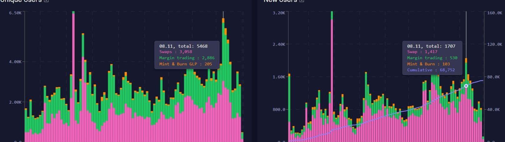 11月9日雖然小幅下滑至9億美元左右,但11月10日GMX再度回升,并創下歷史記錄,日交易量達11.9億美元的新高。不過從用戶角度看,無論是日活躍用戶數還是日新增用戶數,GMX的增長幅度都比較溫和,并未像交易量一樣出現數倍式增長:11月8日,日活躍用戶數達5468的近期新高,相比月初增長近一倍;日新增用戶數則創下1707的近期新高,相比月初增長約51%。