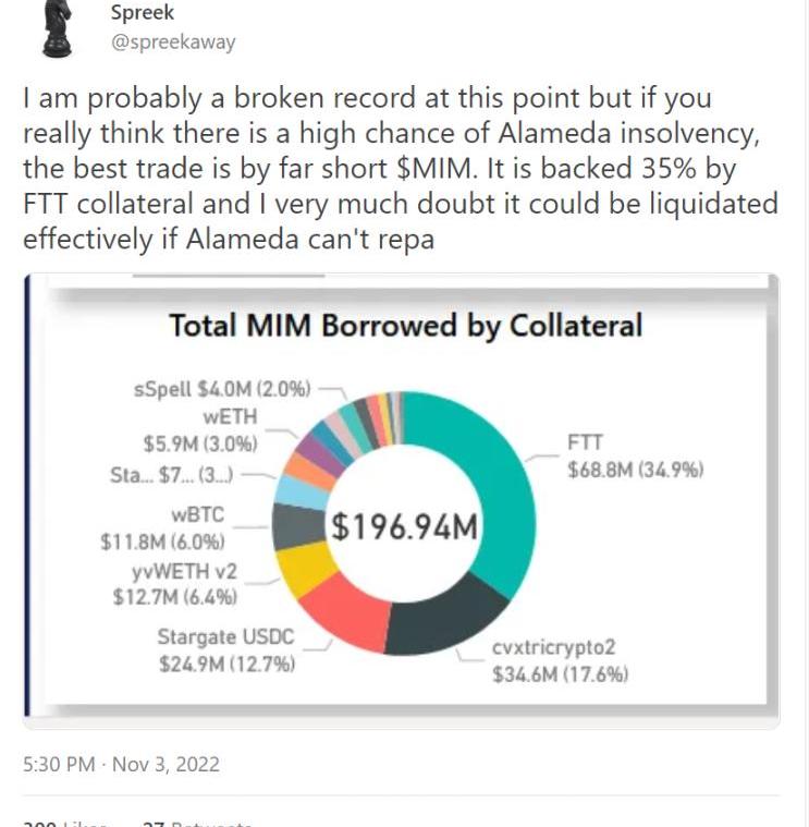 CeFi貸方面臨的另一個關鍵問題是接受不良和流動性差的資產作為抵押品。FTX崩盤就是一個典型例子。AlamedaResearch將FTT和SRM等代幣作為貸款抵押品,由于掠奪性設計,FTT等代幣被人為地抬高了完全稀釋后估值。因為這些代幣的流通量百分比非常低,這使得Alameda提高了其借貸能力。實際上這些代幣市值完全是海市蜃樓,在大規模清算期間,市場上沒有足夠的流動性來支撐這些估值。這就是為什么像FTT和SRM這樣的資產在上周因Alameda的抵押品被清算和FTX崩潰而大幅拋售的原因。除了抵押品質量問題,還有就是遲緩的清算流程。在CeFi中,清算是手動的,不是基于智能合約的,這意味著貸方有可能因未能及時出售貶值的抵押品而承擔水下債務頭寸。如果貸方對抵押品實施更嚴格的標準,這些問題可能會有所緩解。許多DeFi協議也利用「不良」非流動資產作為抵押品。11月3日,就在FTX和Alameda倒閉前幾天,Abracadabra的去中心化MIM穩定幣總供應量的35%是有FTT代幣作為支持的。