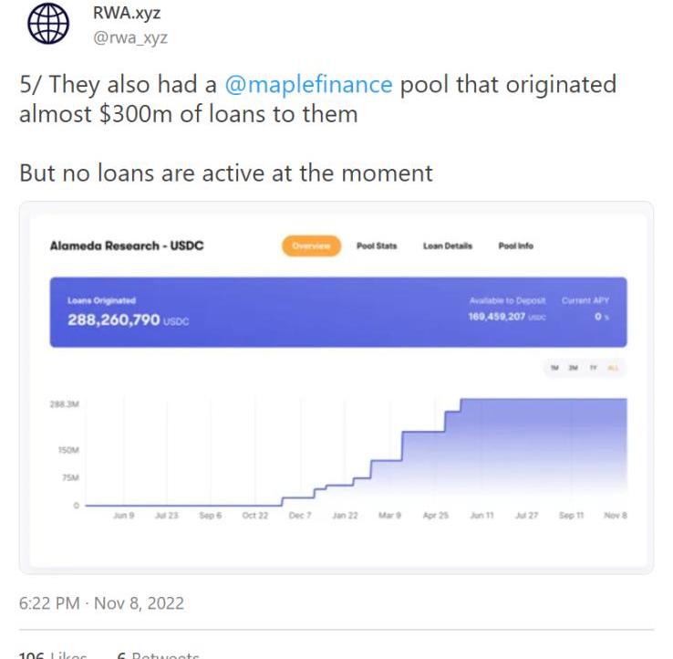 風險:作為貸方,必須相信借貸的實體會償還貸款。在借出任何大筆款項之前,必須進行徹底的盡職調查。不要盲目相信借款人的還款能力。這是本文中涵蓋的風險最高的無抵押貸款類別!如果借款人破產,還款要求將與對實體資產的所有其他要求一樣。破產程序,特別是對于自營貿易公司和對沖基金等高度復雜和極其復雜的金融實體而言,通常需要數年時間才能結清,例如Mt.Gox的受托人最近通知債權人在7月份登記還款。如下圖所示,Alameda目前在TrueFi上的未償債務超過1200萬美元。該基金的貸方將無法收回債務,而且很可能無法達到5.33%的收益率。雖然目前尚不清楚該流動性池的價值減值情況,但很可能會大幅縮水。