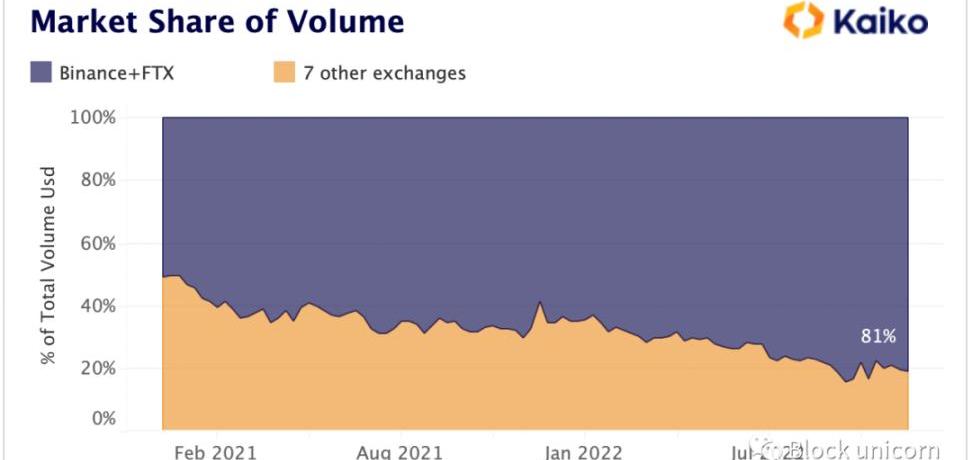 雖然收購似乎已經全部夭折,但一個Binance+FTX的巨無霸究竟會是什么樣子?自2021年開始,相對于11個流動性最強的交易所,Binance的市場交易量份額已從47%攀升至71%,它的總交易量比其他所有交易所的總和還要大。雖然FTX的交易量只是Binance的一小部分,但該交易所在犧牲其他交易所的情況下經歷了相當大的增長。在同一時期,FTX的市場份額從2.5%攀升至7.5%,使該交易所成為Binance僅次于Coinbase的最強大的競爭對手。