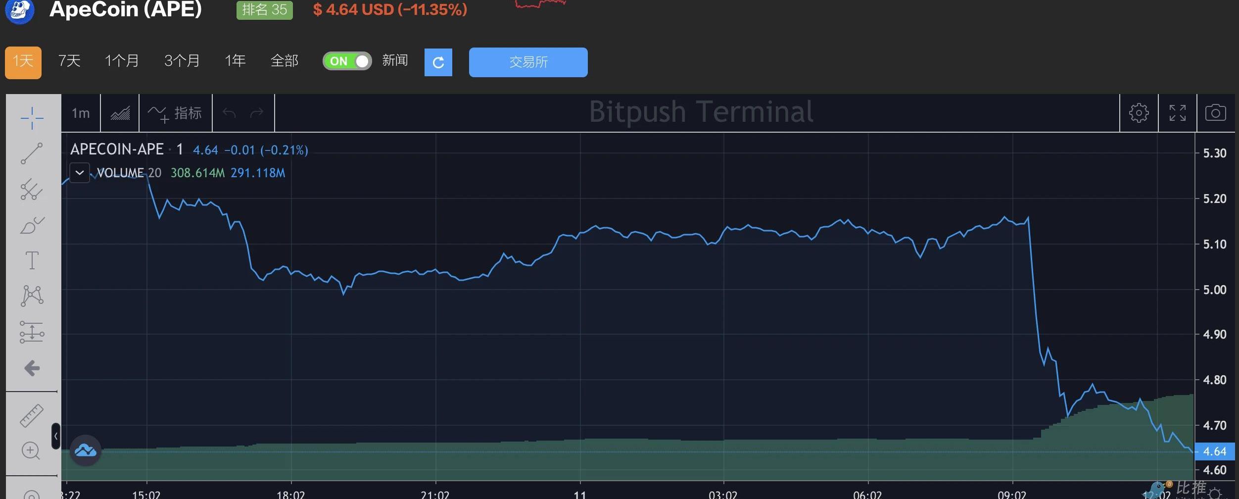 XRP/HKD-0.2%據彭博社報道,美國證券交易委員會正在調查YugaLabs的BoredApeYachtClubNFT和ApeCoin代幣是否為未注冊證券。一位不愿透露姓名的知情人士稱,SEC正在研究YugaLabs發行的NFT是否應該遵循與股票相似的聯邦法律,以及去年3月分發給某些BoredApeNFT持有者的ApeCoin是否等同于證券。YugaLabs尚未被指控有任何不當行為,調查不一定會導致指控。該消息傳出后不久,ApeCoin交易量激增,代幣價格暴跌。比推終端數據顯示,APE在過去24小時內下跌超過11%,截至北京時間10月12日04:00AM,交易價格約為4.64美元。