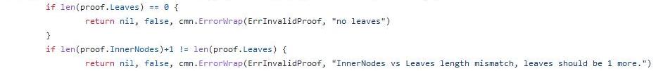 基本上,當你驗證一個IAVL樹時,你指定了一個“操作”列表。幣安跨鏈橋通常需要兩個操作:“iavl:v”操作和“multistore”操作。以下是它們的實現:https://github.com/bnb-chain/bsc/blob/46d185b4cfed54436f526b24c47b15ed58a5e1bb/core/vm/lightclient/multistoreproof.go#L106-L125為了偽造證明,我們需要兩個操作都成功,并且我們需要最后一個操作返回一個固定值。通過查看implementation,我們可以發現,操縱根哈希是不可能的,或者至少非常困難。這意味著我們需要我們的輸入值等于其中一個提交id。