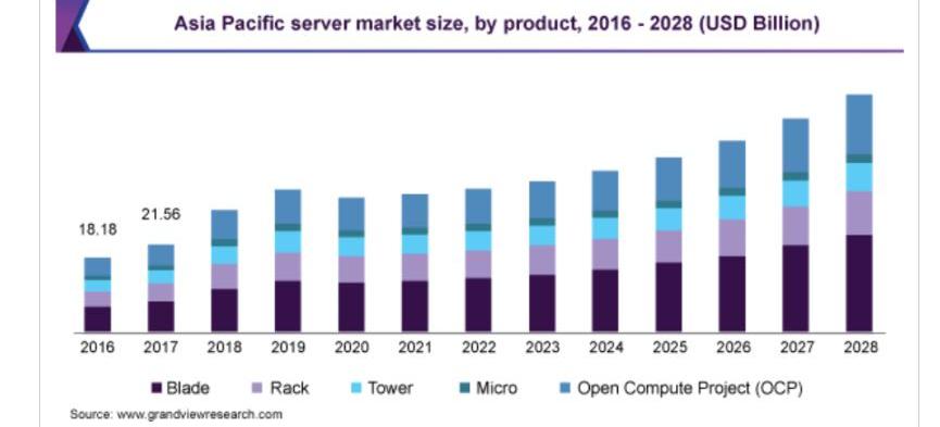 根據grandviewresearch的研究,2020年全球服務器市場規模為836.6億美元,預計從2021年到2028年將以7.8%的年復合增長率增長。增長的原因主要來自于全球新數據中心數量的增加,包括一些云服務提供商和行業,如IT和電信,醫療保健,BFSI以及政府和國防,正在升級其服務器以管理不斷增長的數據量,因為IT基礎架構的升級為管理更高的數據量提供了增強的安全性、存儲和處理速度。