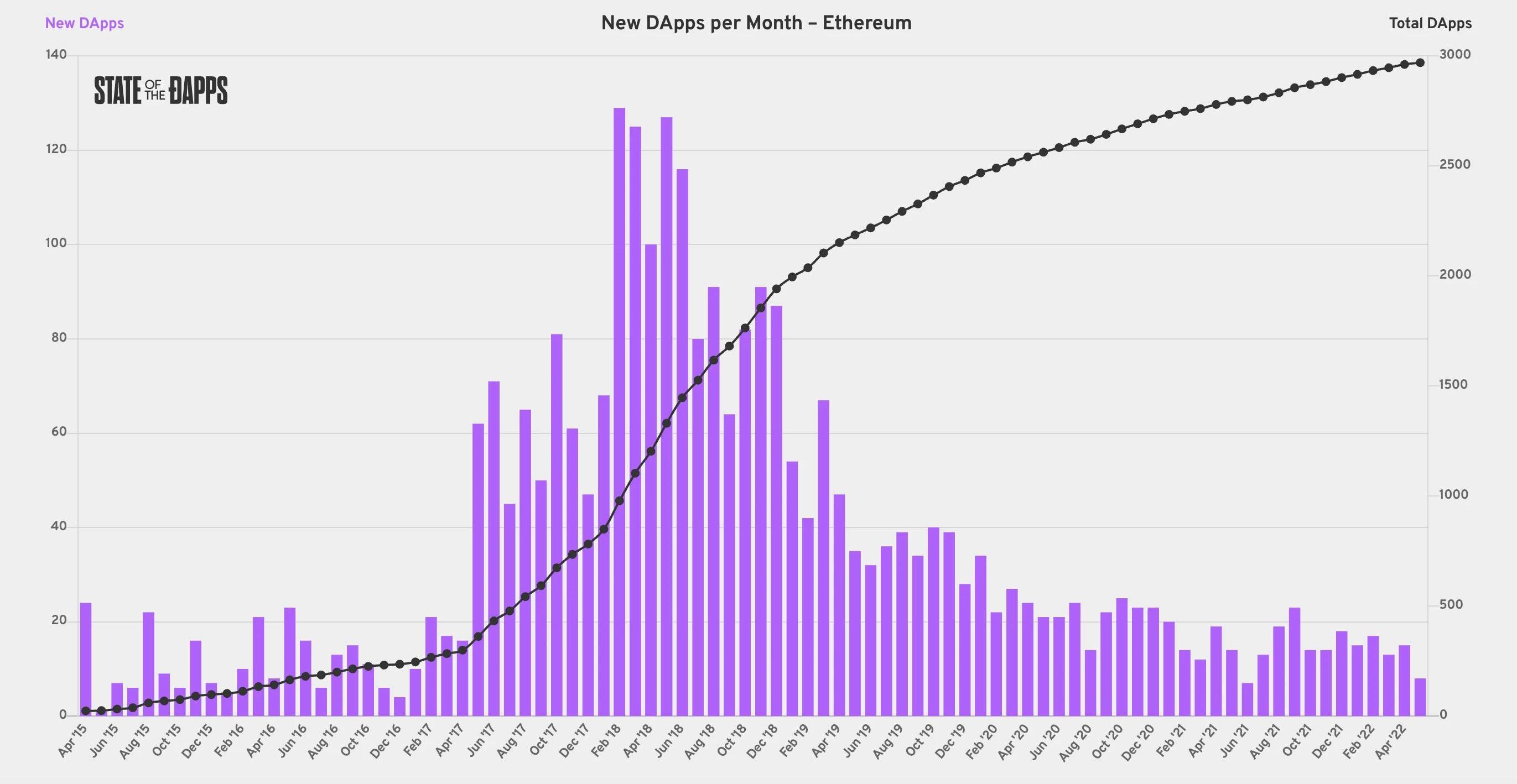 以太坊月新增Dapp數量以太坊的優勢在于資金、應用沉淀已經形成潮汐效應,其他公鏈始終無法擺脫對以太坊的依賴,而兼容EVM-跨鏈橋-更便宜的手續費、更高的效率,以此三板斧轉化為自己流量的嘗試一直在發生,但并未有人成功過。鐵打的以太坊,流水的新公鏈。