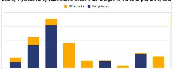 在2022年前十大加密貨幣攻擊中,黑客總計竊走了超過17億美元的資金。跨鏈橋的被盜資金規模最高,比如RoninNetwork被盜5.4億美元,Wormhole被盜3.25億美元,NomadBridge被盜1.9億美元,HormonyBridge被盜1億美元。最近的跨鏈橋被盜是10月7日,BNBChain官方橋BinanceBridge遭遇黑客攻擊,Binance之后發布的一份聲明稱,本次攻擊大約有1億美元沒有收回,其余的資金則被凍結。