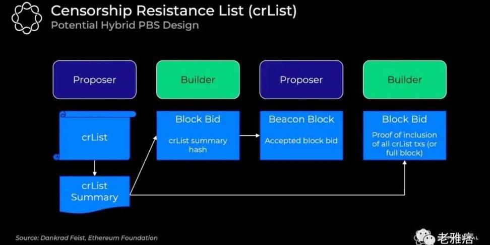 提議者發布一個crList和crList摘要,其中包括所有符合條件的交易。建設者創建一個提議的區塊,然后提交一個包含crList摘要的哈希值的出價,以證明他們已經看到了它提議者接受中標者的出價和區塊頭(他們還沒有看到區塊體)建設者發布他們的區塊,并包含一個證據,證明他們已經包含了來自crList的所有交易,或者區塊已滿。否則,這個區塊將不會被分叉選擇規則所接受。認證者會檢查發布的主體的有效性請注意,你實際上也可以在enshrinedPBS之前實現crList的某些版本,盡管它看起來會有所不同。這里有一個來自Flashbots的Quintus提出的建議。在enshrinedPBS之前,替代crList提案也在進行中。應該優先考慮某些形式的納入清單,甚至可能是一些最小形式的enshrinedPBS。期待這里會有更多的建議。Barnabé提供了另一個類似的想法。本質上,提議者可以為區塊創建一個前綴,以包含頂部的其他審查交易,,然后建設者可以構建剩下的部分(或者如果沒有審查的交易要包括的話,可以構建整個區塊)。使用EigenLayer通過MEV-Boost保留區塊提議者代理