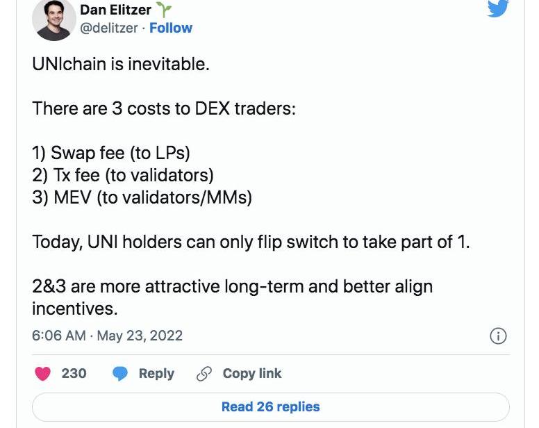 如果交易者在Uniswap上交易平均支付66個基點的費用,而Uniswap很容易成為DEX中的市場領導者,那么UNI持有者應該有足夠的能力來獲得其中的一部分。目前,UNI持有人可用于價值獲取的唯一途徑是使用治理來啟動費用開關,并從目前流向LP的swap費用中分一杯羹。如果費用開關已打開并設置為UniV2中使用的水平,那么在過去一年中,它將為UNI持有者帶來約1.93億美元的收入。當然,這些潛在利潤并沒有考慮到啟動費用開關對LP的盈利能力產生的負面影響,而這幾乎肯定會導致流動性減少和交易量的減少,從而降低費用收入。這是使用swap費用作為UNI持有者獲取價值來源的核心問題:它會在市場中引入價差,必然使其成為一個效率較低的交易場所。那另外兩個成本,gas交易費用以及MEV呢?只要Uniswap依舊依賴于以太坊或其他通用鏈和rollup運行,UNI持有者目前就沒有很好的方法來利用其中的任何一個。下面進入UNIchain。如果Uniswap將其大部分活動遷移到自己的鏈上,其中UNI持有者是驗證者,它將立即為降低交易成本和獲取價值提供強大的選擇。首先,與其向以太坊驗證者支付大量固定的gas費用,不如將這些成本降低一個數量級或更多,立即使交易的成本大大降低,因此整體交易效率更高。令人驚訝的是,Uniswap迄今為止取得了成功,交易者在固定gas費上的平均支出高于基于交易量的swap費用。使固定gas費用成為交易成本的一小部分,對于交易者來說將是一個巨大的勝利,而讓UNI持有者而不是ETH持有者獲得這些費用將是對UNI現有的“無價值治理代幣”模型的重大改進。其次,控制驗證器/排序器意味著UNI持有者將能夠采取措施將交易者的MEV成本降至最低,例如通過實施門限加密算法或批量swap,以相同價格執行區塊內資產之間的所有交易。MEV的減少將使Uniswap成為一個更有效的交易場所,但在MEV無法完全消除的情況下,至少Flashbots拍賣式系統將確保大部分MEV可以內部化給UNI持有者/驗證者,而不是交給ETH持有者/驗證者。這最終類似于訂單流支付(PFOF)的一種形式。
