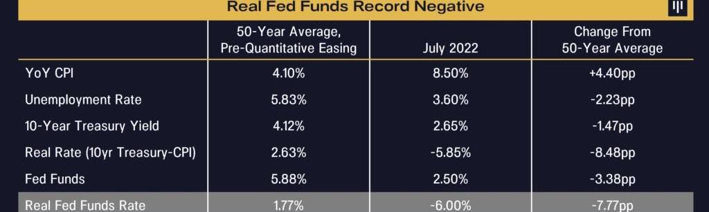 雖然現在的共識是,美聯儲允許通脹率高于其隔夜政策利率830個基點是一個巨大的失敗,但卻很少有人解決同樣重要且持續的政策錯誤:將長期政府債券和抵押貸款債券收益率控制在遠低于自由市場的水平。正如比爾·阿克曼所說,美聯儲主席不允許長期利率調整到公平市場水平。因此,美聯儲仍在大規模刺激住房和機動車等利率敏感型行業。實際回報率是投資者在通貨膨脹后獲得的債券收益率。對于美國10年期國債,量化寬松之前的五十年平均實際利率為+2.63%。美聯儲決定印刷占國家GDP一半的鈔票,來推高債券價格,迫使實際利率降至-5.85%。