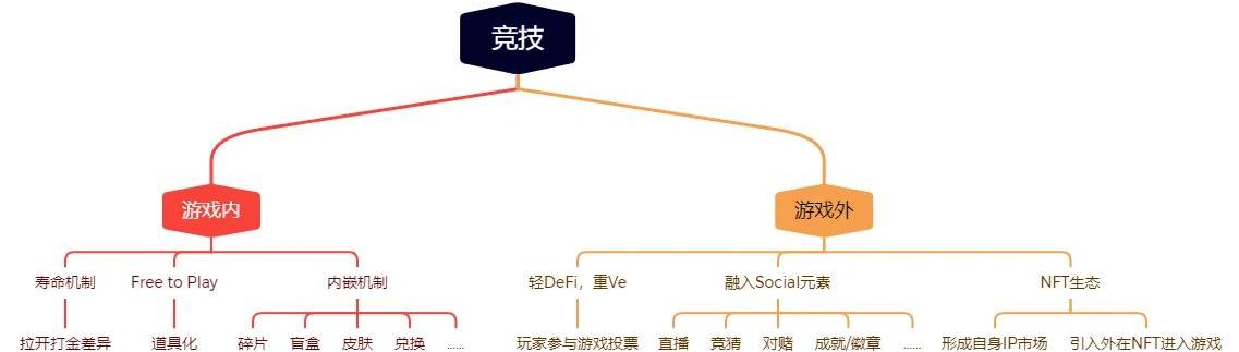 簡易W2E模型如同其他P2E鏈游一樣,簡單的模型無法持續供應長期的高打金收益,無論英雄NFT是否是無限生息資產,項目的最終結局都是一樣,無非是像Thetan這種沒有壽命機制、或有零擼可能,豪華套餐就可以迅速將項目擼禿。③賽季排名法項目拿出一定代幣作為獎勵,按玩家排名分配給每個賽季或具體比賽的獲勝者們。這種跟Web2的比賽獎勵等沒啥區別,如今很多未發代幣的競技鏈游大多都采用這種方式,關鍵點就是:獎金、分配份額等都固定,不會有不可控的支出持續一段時間,玩家若參加就需堅持活躍隨機性的收益、玩家之間需要博弈內卷、項目方只需提供固定支出等這些,對于項目團隊都屬于正向效應。但關鍵就在于每次活動的獎金,如何在玩家積極性和合理支出之間尋找一個平衡,并能長期保持。3、競技類鏈游的探索方向競技類鏈游由于天然較強的可玩性,因此在玩家吸引和留存都有著優勢,同樣在經濟模型設計方面難度也較大。我們從游戲內和游戲外兩種不同的場景下,提出一些個人看法: