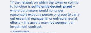 2018年6月,SEC的公司財務部主任WilliamHinman在演講中提出了“充分去中心化”,Hinman說:“如果代幣或其背后的運行網絡足夠去中心化,也就是購買者不再期望個人進行必要的管理經營努力,這種資產就不屬于投資合同。”基于這個邏輯,Hinman認為以太坊不屬于證券銷售,因為當前的以太坊網絡足夠去中心化。
