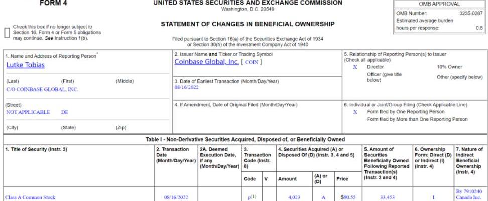 巴倫周刊的消息指出,Shopify首席執行官TobiLutke于2022年8月一直在購買Coinbase股票,下圖是Lutke向美國證券交易委員會提交的表格,在8月11日和16日共支付了746436美元購買了,953股Coinbase股票,每股平均價格為93.86美元。