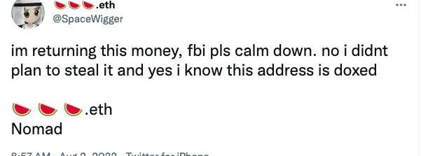 合約設計漏洞只是問題之一,Nomad官方在這次事件中反應也相當「遲鈍」,缺乏風控。在foobar發布推文時,跨鏈橋中依然有1.3億美元資產,直到官方發布推文時依然有7500萬美元資產,但Nomad官方卻似乎沒有做任何緊急動作,眼睜睜看著資產流失歸零。CelerNetwork聯合創始人MoDong在社群解釋稱,官方之所以「無動于衷」,主要是因為合約升級加上了時間鎖,導致其沒辦法第一時間作出反應。“合約升級還有時間鎖,也沒有風控,所以只能干看著+自己擼自己。”實際上,在第一個黑客盜竊完成后,這條「成功」經驗也在加密社區瘋傳,被更多用戶模仿,趁火打劫。可能是因為過于心急,一些用戶忘記使用馬甲偽裝,直接使用了自己的常用ENS域名,暴露無遺。目前已經有用戶開始自發退款,以求避免被起訴。關于后續進展,Odaily星球日報也將持續關注。