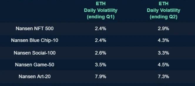 圖12:NansenNFT-500(ETH)買家跟賣家的比率在2022年第一季度,NansenNFT-500(ETH)的每日波動率為2.4%。然而,當我們將分析擴展到第二季度的數據時,這種波動性增加了。幾乎所有NFT指數都顯示波動性增加,與大盤一致,但Art-20指數除外,該指數在藝術NFT的波動性。各個NFT板塊的波動性仍有很大差異,繼續觀察2022年Q1季度的情況。此外,根據我們之前的季度報告的洞察,元宇宙NFT行業仍然是波動性最大的。