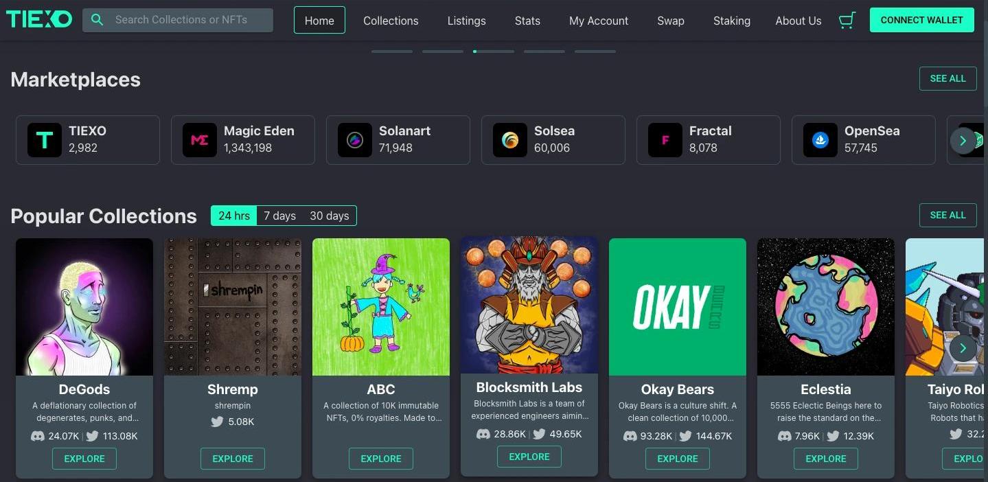 網站:https://tiexo.com/推特:https://twitter.com/tiexohqTIEXO是一個將所有SolanaNFT市場列表和統計數據匯總到一個平臺的項目,TIEXO通過統計和分析這些數據來優化NFT購買體驗。目前,TIEXO聚合了來自10個不同NFT市場的超過9,627個集合、11,662,898個NFT和1,628,851個列表。TIEXOMarketplace于2021年12月10日推出。該市場可以監控你列出的待售NFT以及可以查看你的收藏品排名和稀有度。TIEXO為Solana區塊鏈上的50多個項目提供完整的排名和稀有度查詢。此外,該市場制定了一個算法,是根據NFT的上市價格和NFT稀有性來顯示最佳交易機會。