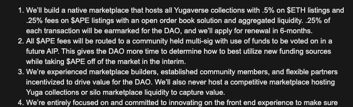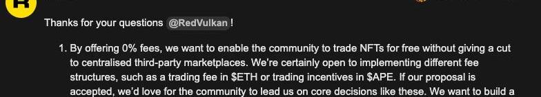 縱覽Rarible、MagicEden、SnagSolution的提案內容,三家提案者均指出了當前市場的交易模式所存在的一些問題,拋開一些相對枝葉的問題不談,核心矛盾體現在如下兩個層面:1.通用型NFT交易平臺往往會收取固定的高額手續費,且這些費用不會回流至項目本身。以OpenSea為例,BAYC、MAYC、BAKC過往已為該平臺帶來了高達30000ETH的手續費收入。2.APE作為ApeCoin生態內的基礎通證,當前除了治理之外幾乎沒有其他實際的價值效用。用戶甚至無法用APE來購買NFT,NFT二級市場交易活動所產生的價值也不會流向APE。作為NFT歷史上最成功的系列作品,BAYC及其相關系列的交易量占據著相當大的市場比重,二線交易平臺們很清楚,如果能夠成功將其“納入麾下”,將是這些平臺們追趕甚至反超OpenSea的絕佳機會;反過來,對于ApeCoin社區來說,他們也樂于看見一個費用更低且可賦予APE更多價值的定制市場的出現。需求上的一拍即合,客觀上給了Rarible們“可趁之機”。那么,如果橫向對比Rarible、MagicEden、SnagSolution三家的提案,究竟誰家的策略更得ApeCoin社區的人心呢?整體來看,Rarible、MagicEden、SnagSolution最大的異同均體現在了交易手續費之上,三項提案都選擇了大幅降低手續費,但具體的費用設置上存在一定差異:Rarible選擇了完全0%的費用設置。不過,在后續回復社區用戶疑問時,Rarible也表示對費用結構的設置完全由社區決定,如果社區希望為APE設置一定的費用激勵,那當然也可以。這個新市場是屬于ApeCoin社區的。