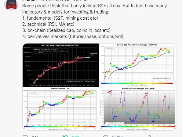 XRP/HKD-0.92%近日推特KOLPlanB例舉了自己除了熟知的S2F以外常用的輔助決策的幾個指標模型,鑒于當前波動較大的行情走勢以及暴跌后的抄底情緒,我們將這些指標模型展開介紹,以供參考使用之需。有趣的是,Vitalik剛剛對S2F發出了批評。他表示,S2F模型現在看起來確實不太好。我知道幸災樂禍之類的事情是不禮貌的,但我認為金融模型給人們一種錯誤的確定性和預定數字會增加的感覺,這是有害的,他們應該受到所有的嘲笑。PlanB剛剛表示,從2019年3月到2022年3月S2F模型運行良好。根據S2F模型,目前要么BTC被極度低估并很快反彈,要么S2F在未來變得不那么有用。