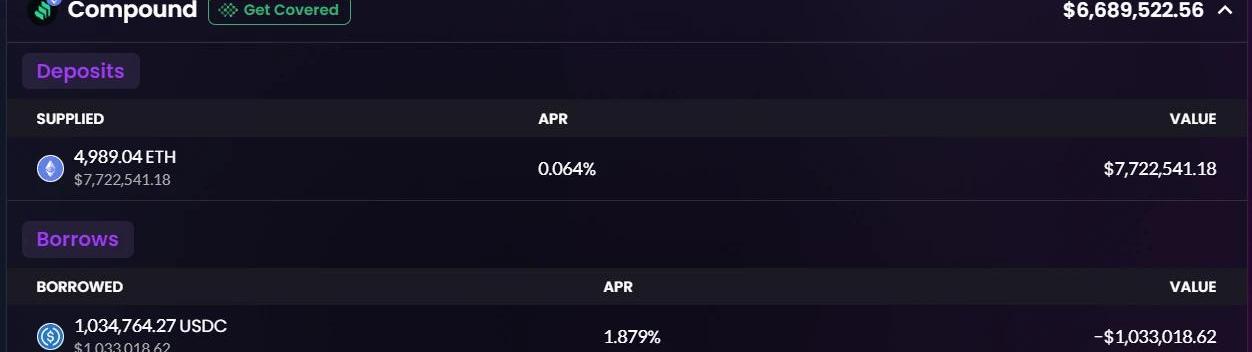 學習了加密借貸的基礎知識后,接下來就是尋找機會。Discord和Twitter是獲取加密領域重大動向的最新消息的來源。請記住一些關鍵指標,包括利率、存取款限制、支持資產類型、貸款期限、費用和平臺風險。為了進行更深入的分析,可使用Nansen的ApeBoard進行跟蹤,可以看到特定錢包的公開借貸倉位。例如,下圖顯示了一個位于Compound中的示例錢包。