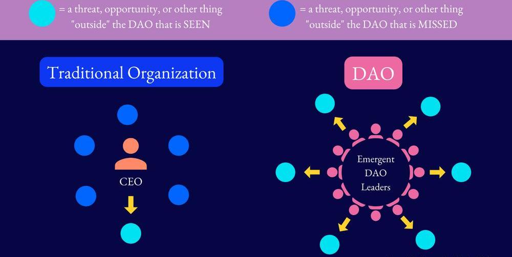 在這個圖表中,淺茶色的圓圈是領導者看到的威脅、機會或其他"DAO之外"的東西。深藍色的圓圈是被遺漏的東西。在一個傳統的組織中,CEO只看到一個威脅/機會/事情,而錯過了其他方面。在DAO中,領導者看到了所有面,因為有多個具有不同觀點的領導者在進行偵查。越多具有不同觀點的關鍵貢獻者領導DAO時,他們發現的威脅和機會就越多,DAO就越能靈活應對動蕩的局勢。培養分布式領導的挑戰:擁有各種不同觀點的領導人,但仍然團結在一個單一的使命之下。確定什么級別的決定可以在不需要投票或得到DAO廣泛批準的情況下做出。確保DAO不會對太多的機會采取行動,使貢獻者和資源都耗盡。信息公開:每個人都可以獲得他們需要的信息