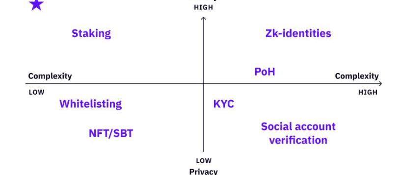 因此,在投票前和投票期間處理女巫攻擊很重要。可問題是,我們該如何驗證選民的身份?目前有一些現有/即將推出的方法:KYC、白名單、社交賬戶驗證、NFT/靈魂綁定代幣和zk-identity/零知識證明的身份驗證。同時,由于每種身份驗證方法都有其自身的權衡取舍,我們進一步使用以下指標來評估這些權衡:針對女巫攻擊的抵抗性、無需許可性、隱私性和復雜性。針對女巫攻擊的抵抗性是這里的一個主要目標,至少對于區塊鏈治理而言。無許可性很重要。因為許多社區都希望對更廣泛的受眾保持開放,而白名單/KYC人員可能會限制他們的成長潛力。并且,目前使用白名單或KYC方法的成本非常高。隱私性是促進人們表達其真實意見的基礎。復雜性是指在實踐中構建和使用這些方法的難度。我們從不同的維度來分析它們的權衡—開放性與女巫抵抗,隱私與復雜性。