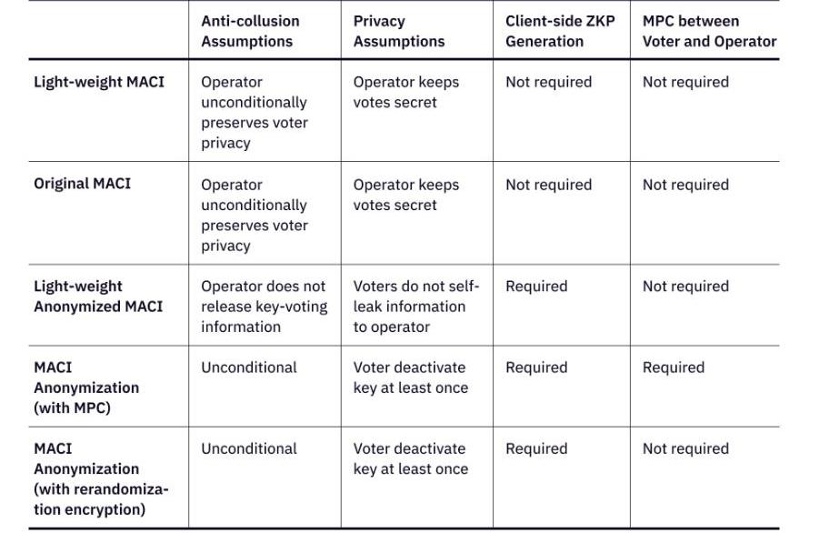 針對不同的隱私和復雜性,設計不同的MACI匿名化方案不同MACI匿名化方案的參考鏈接:輕量級MACI原始MACI輕量級的匿名化MACIMACI匿名化MACI匿名化二次方資助特別容易受到共謀的影響,因為如果某些黨派可以簡單地賄賂更多的選民為自己投票,他們的收益將呈二次方增長。目前,MACI足以增強大多數區塊鏈治理系統中的抗共謀能力。假設匿名化被進一步添加到具有相同用戶體驗水平的現有產品中,以區塊鏈驅動的抗共謀投票系統可以潛在地解決從國家大選到未來太空治理的一系列現實世界的治理問題。